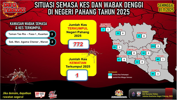 彭州卫生局今日透过面子书公布,从10月26日至11月1日期间,州内有两个活跃疫区,即关丹丽雅花园及马兰县珍诺宗教中学,并且各有2宗病例、